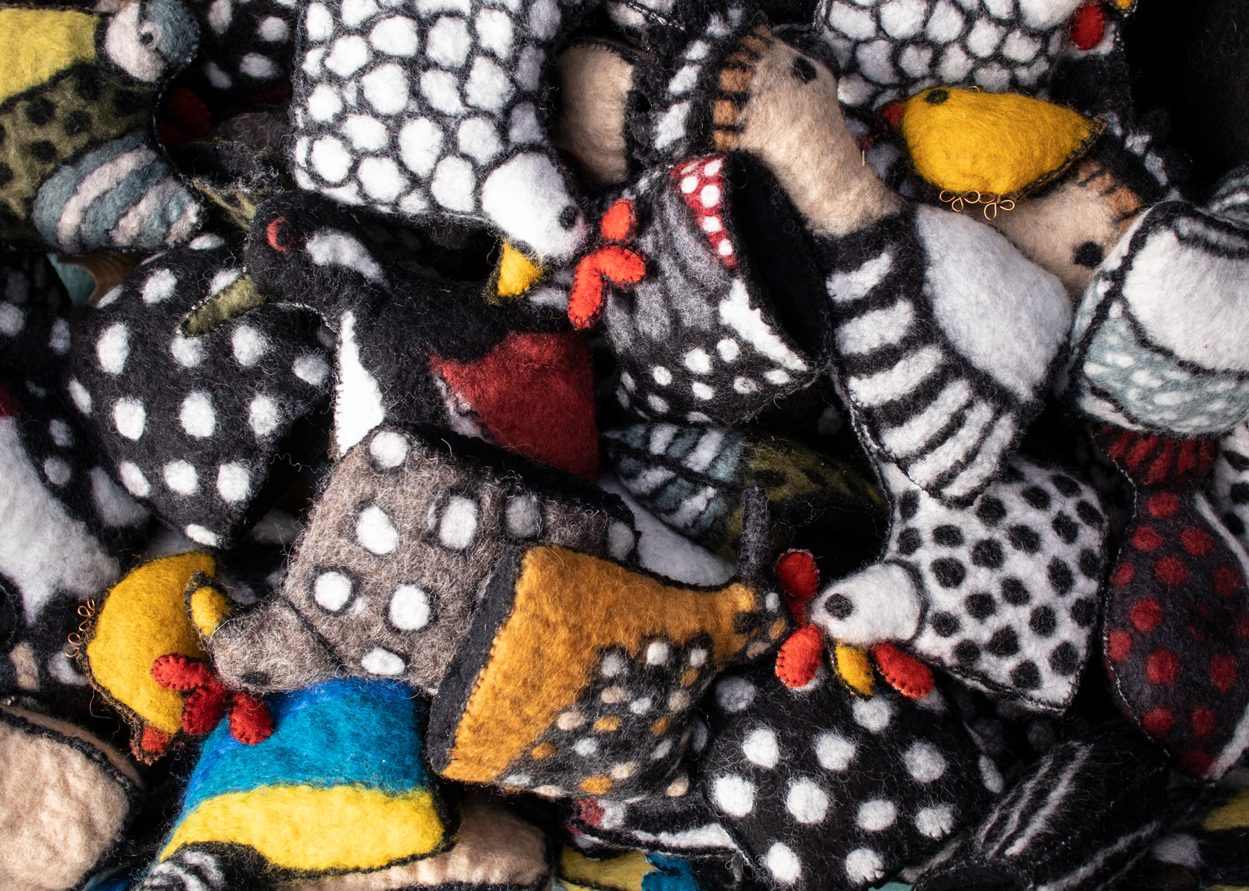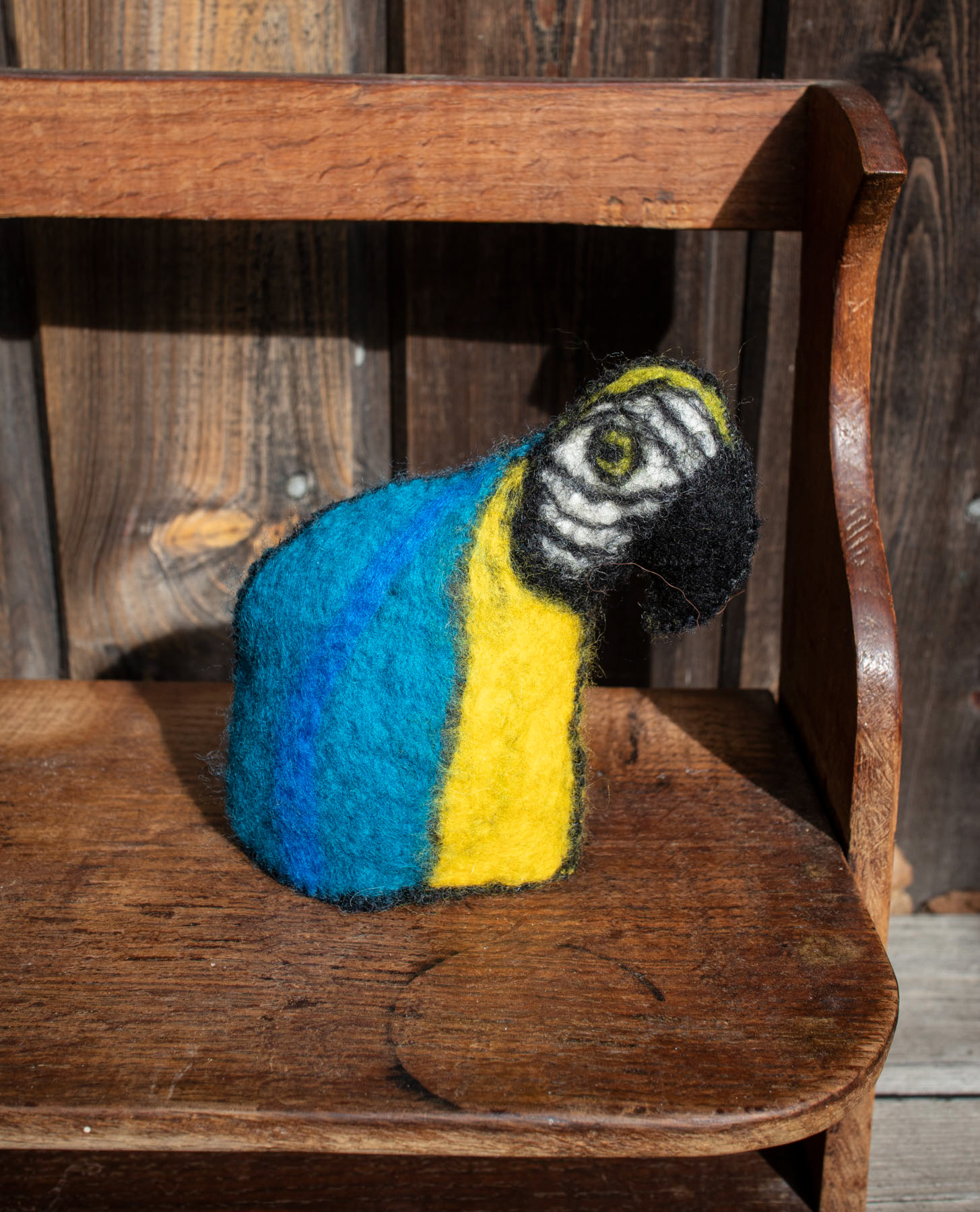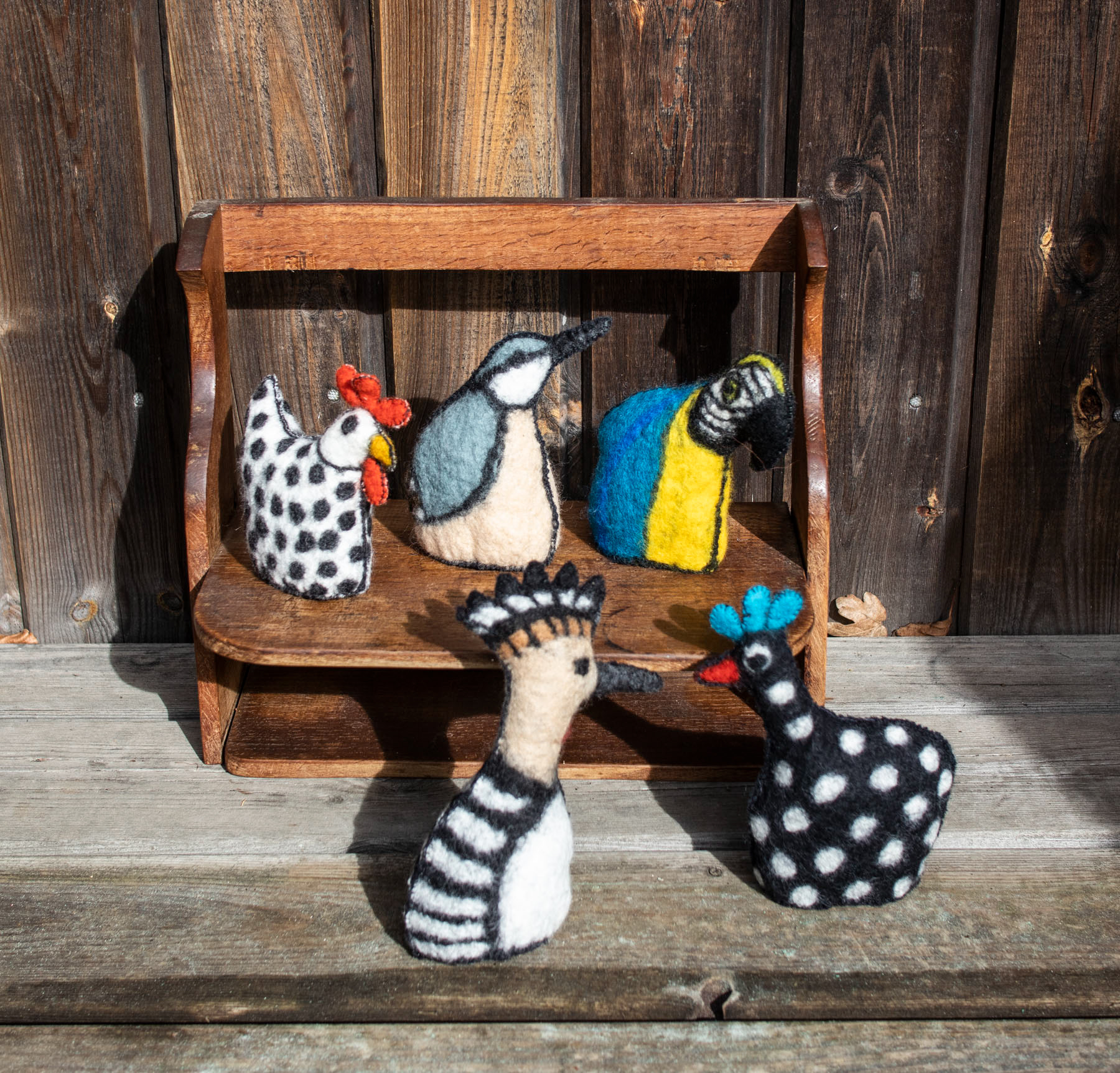 Jeg startede med at filte høns og kyllinger som æggevarmere, men blev inspireret af havens og naturens fugle. Jeg udvikler hele tiden nye fugle designs og de er selvfølgelig min fortolkning, men alligevel tro mod fuglens farver og mønstre. Selvom jeg filter mange af de samme fugle – er der ikke 2 der er helt ens.