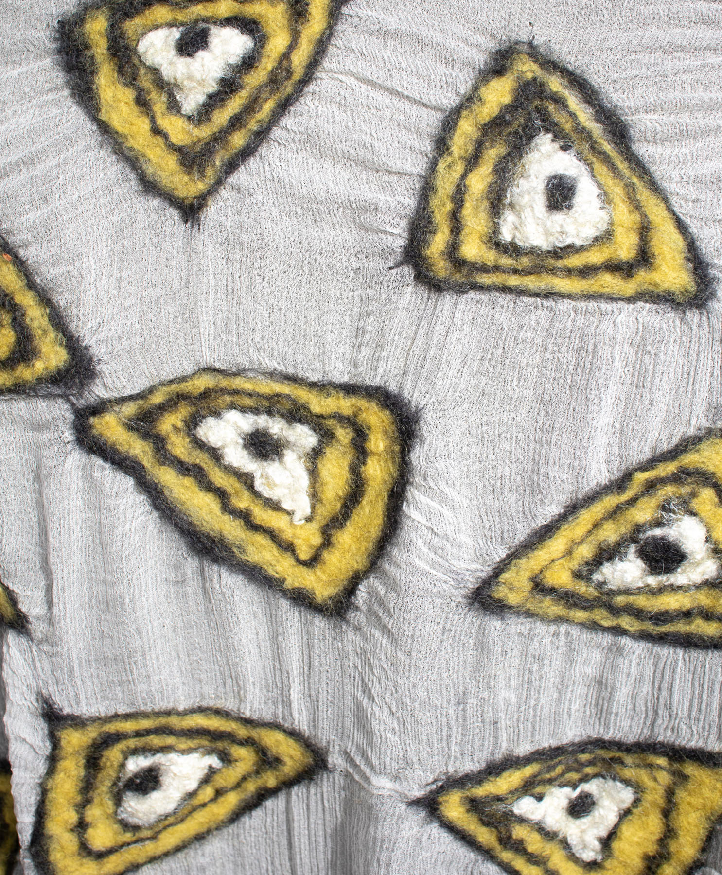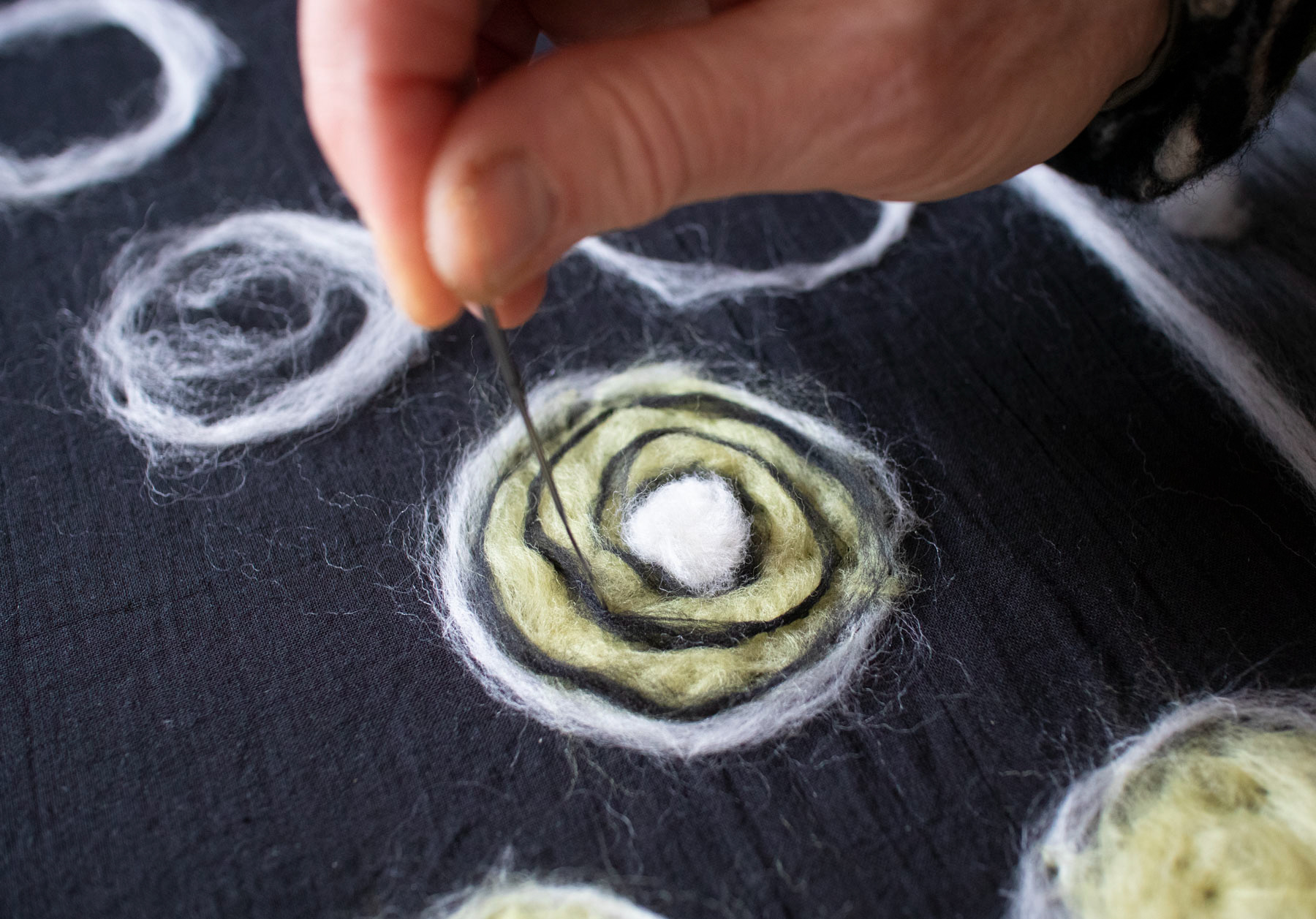 Ulden vådfiltes med varmt sæbevand, så ulden krymper og arbejdes ned i stoffet. Jeg bruger en filtenål til at fæsnte ulden i stoffet, men mønstrene flytter sig under filtningen – og bliver dermed mere levende.
