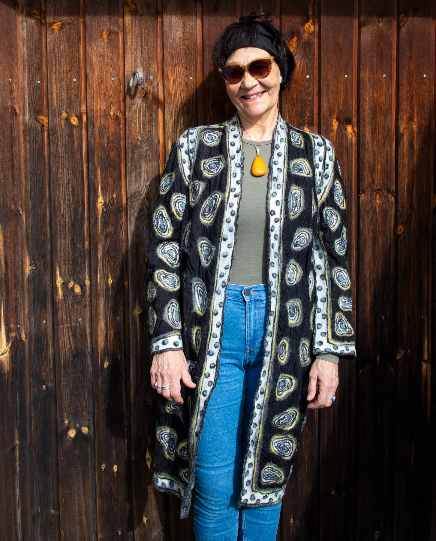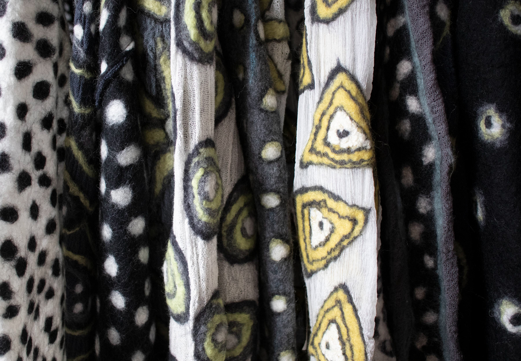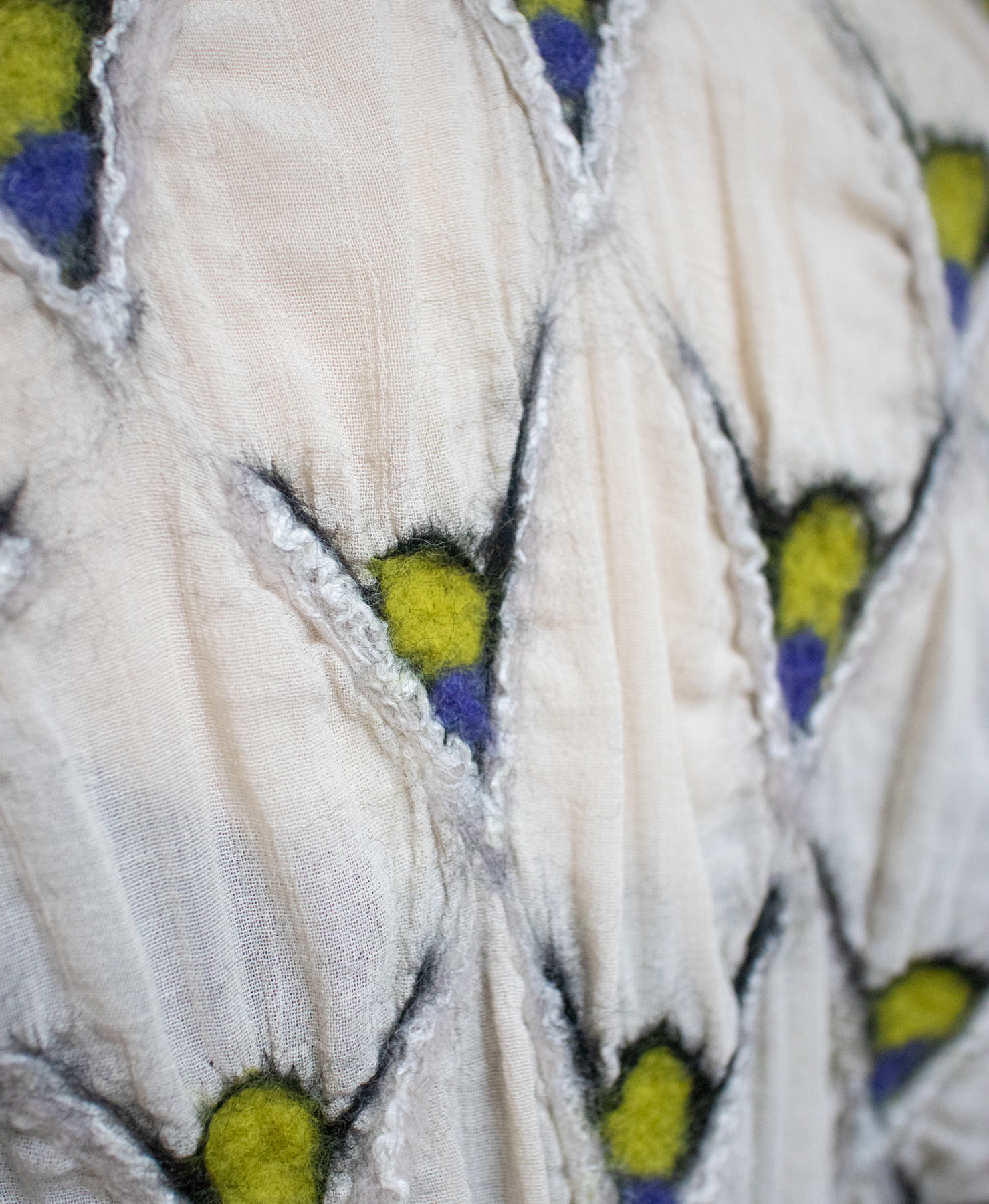 Jeg er især optaget af nuno filt – en teknik hvor ulden arbejdes ned i et tyndt stof – silke, bomuld, viskose eller hør. Ulden arbejder bedst sammen med naturlige fibre. Denne teknik gør det muligt at arbejde med mønstre, farver og figurer – uden at dække alt stoffet, hvilket giver en lethed i designet.