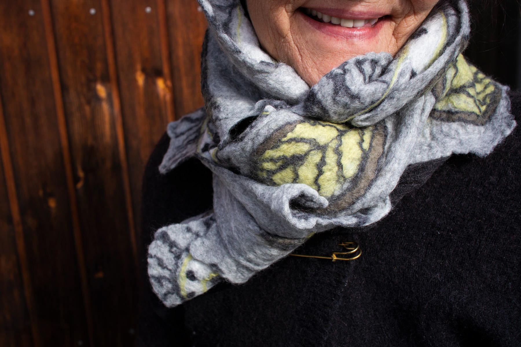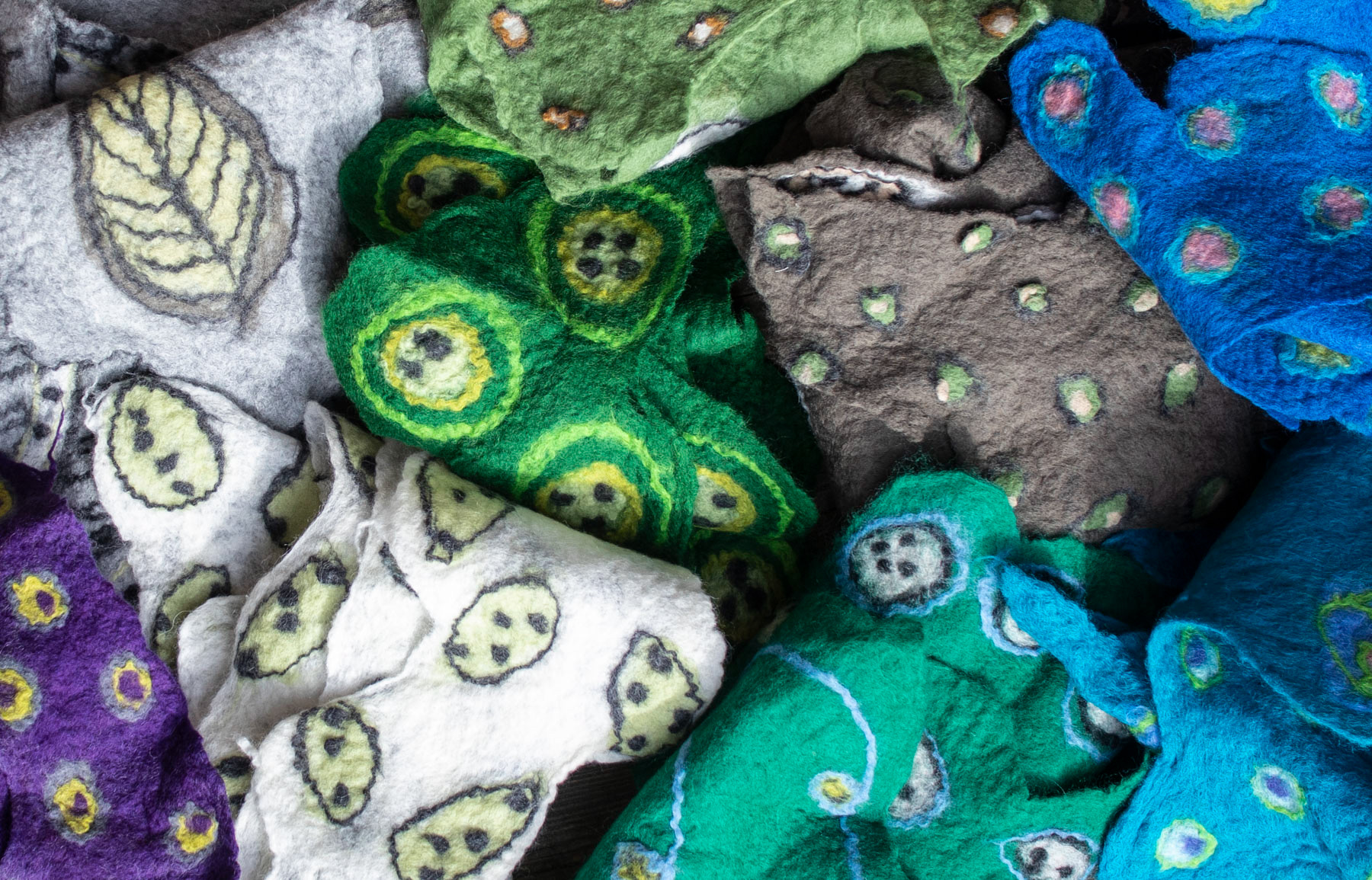 Tørklæderne er filtet med 2 forskellige sider – og er bugtede i formen, så de kan draperes efter behov. Jeg starter med at designe et mønster med farver og figurer. Derefter dækker jeg det hele af med en farve – og får endnu en flade jeg kan lave mønstre på. Når det filtes flytter figurerne og mønstrene sig – og det er altid spændende at se resultatet.